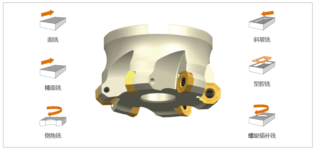 在面铣中应用广泛,可用来做钢件、铸铁等材质的粗铣、半精铣及精铣。