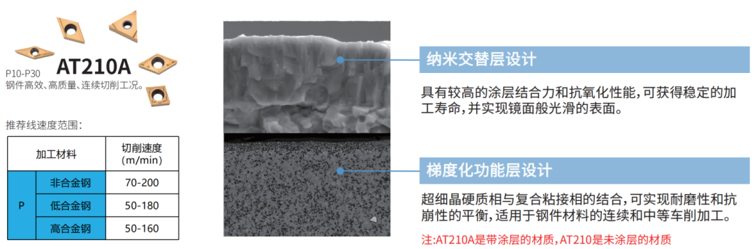 - 金属陶瓷表面与金属材料的摩擦系数低,切削阻力小,可减少积屑瘤形成,AT210A的复合纳米涂层进一步降低了摩擦系数;