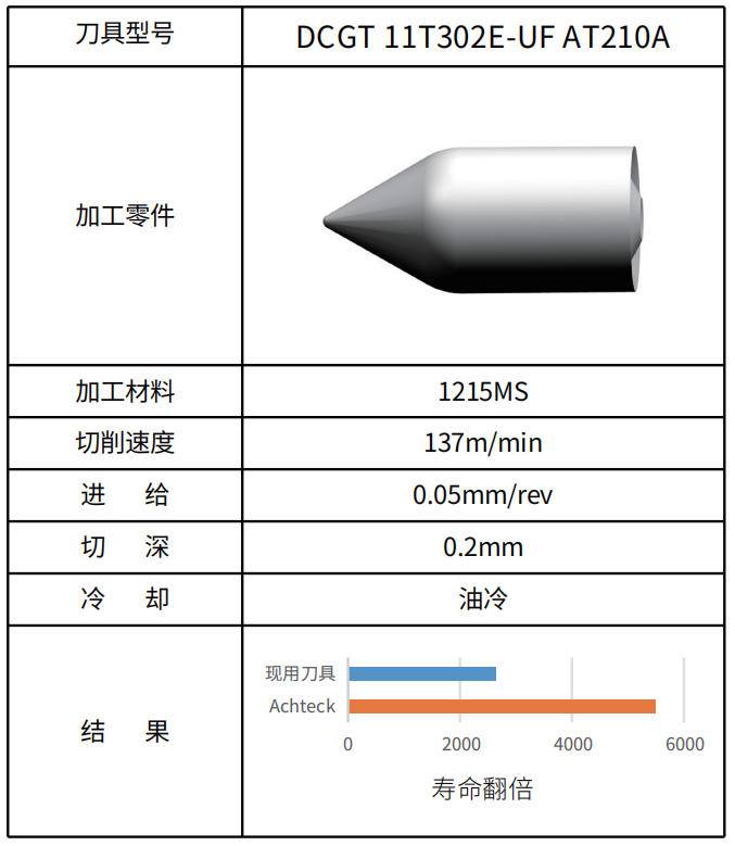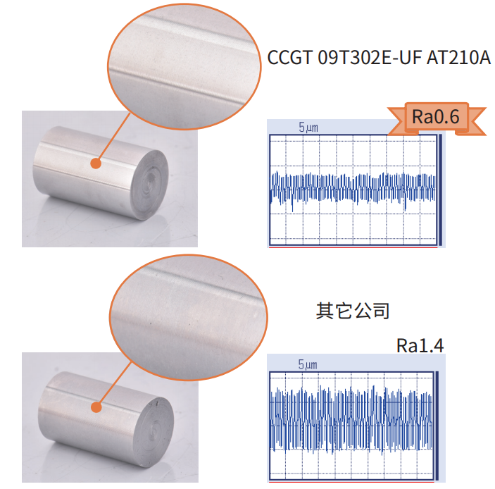 对于钢质小零件加工领域,澳克泰补充了新的材质——AT210A,梯度技术结合复合纳米涂层工艺,应用在精磨级车刀片上,带来高品质的加工表面,实现高精度、高效率的加工。
