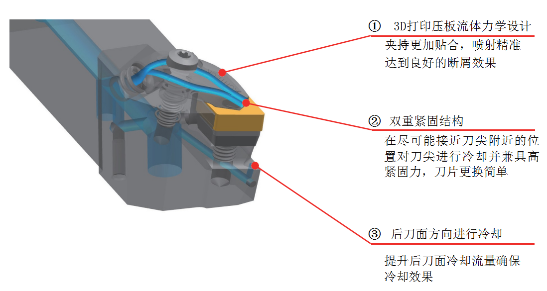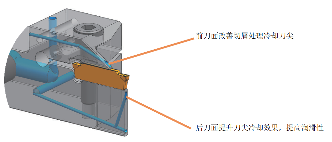 该产品在切削过程中,通过机床内冷装置以7Mpa-30Mpa不等的高压,将冷却液喷射到刀片的前后刀面,达到良好的冷却效果,尤其在面对复杂工况时,是一种理想的解决方案。